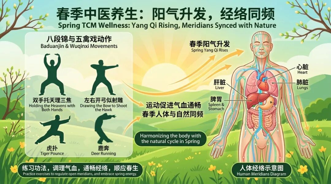 中医认为,春季是阳气升发的季节,人体的阳气也应随之向外舒展。此时若运动不当,如过度剧烈运动,会耗伤阳气;若久坐不动,又会导致阳气郁结。而八段锦、五禽戏等传统功法,正是通过柔和缓慢的动作,配合呼吸吐纳,帮助人体顺应春季阳气升发的规律,达到以下效果: