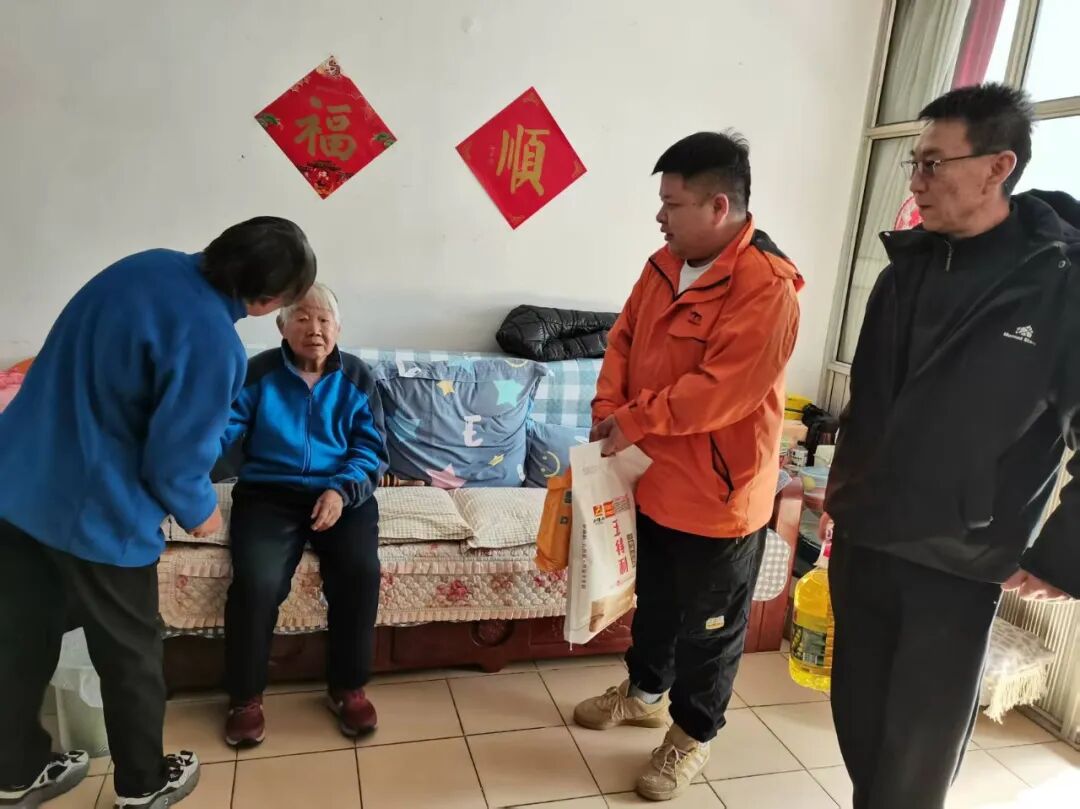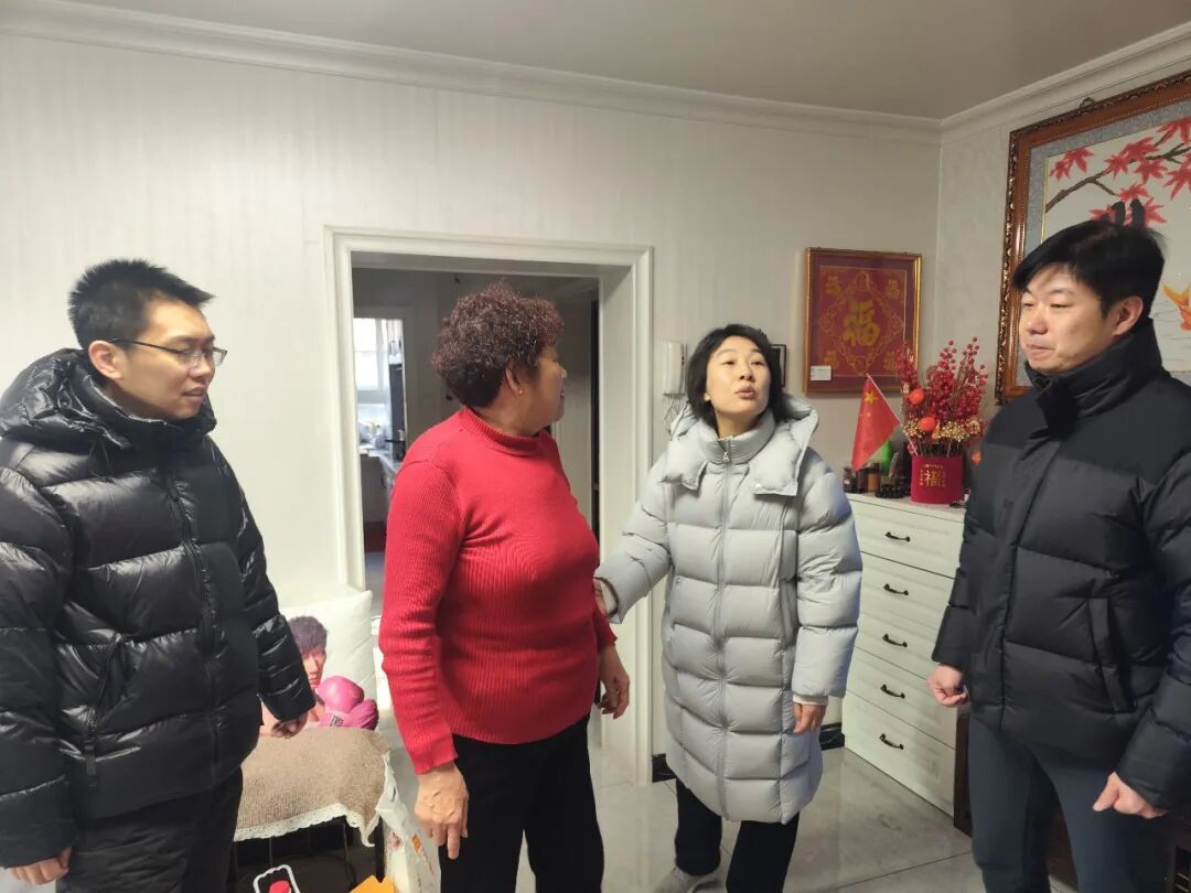 南花园四区社区的很多叔叔阿姨行动不便,无法到现场领取物资。我院志愿者团队特意开展“上门入户”慰问,在社区工作人员的引导下,拎着沉甸甸的米面油,一步步走上楼梯,敲开一户户特殊老年家庭的家门。“阿姨,我们来看您啦,提前给您拜个早年!”推开阿姨家的门,志愿者们的问候瞬间让小屋充满暖意。大家一边把物资轻轻放在门口,一边细细询问阿姨的生活起居:“您平时买菜方便吗?家里暖气够不够热?”得知阿姨独自生活,志愿者们反复叮嘱她注意用火用电安全,有任何困难都可以联系社区或医院。